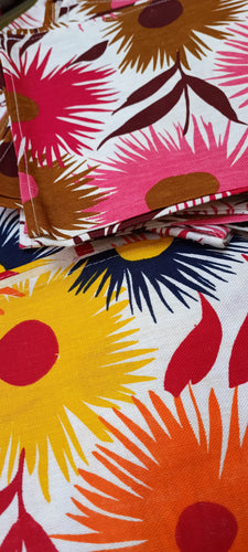 Dodici tovaglioli fantasia rossa e sei fantasia gialla, in puro cotone. 500g.