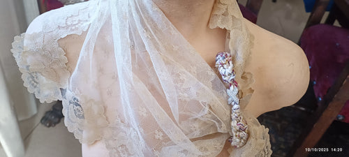 Triangolo di pizzo vintage, colore beige con abbinato bracciale ferma foulard. 200g.