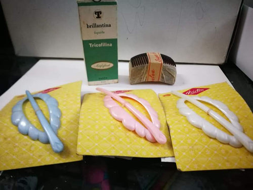 Vintage per collezionisti. Brillantina Tricofilina, confezione di pettinesse e tre fermagli capelli. 200g.