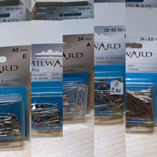 Cinque confezioni MilWard di spilli e spille di sicurezza di varie misure. 200 g.