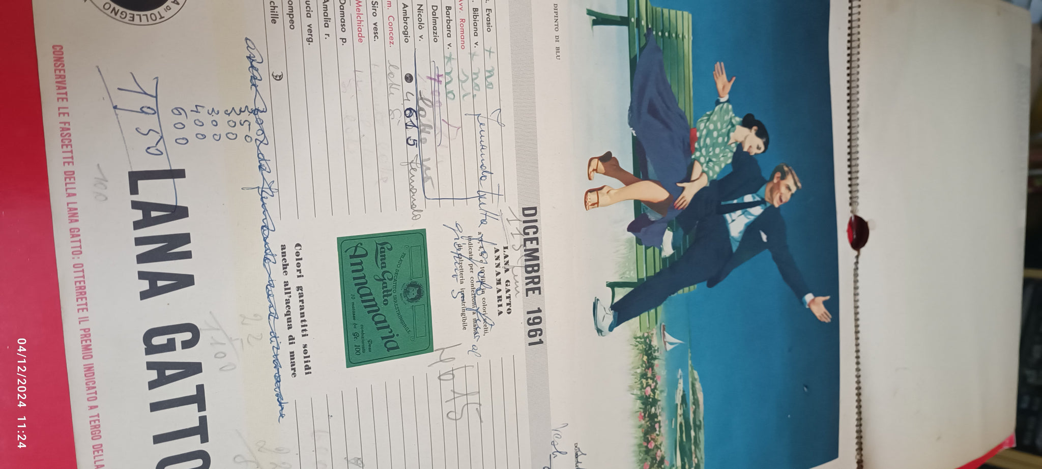 Calendario vintage della Lana Gatto del 1961 con testi di 12 testi di canzoni di Sanremo. Calendario usato con appunti a penna . 100 g €9,90.