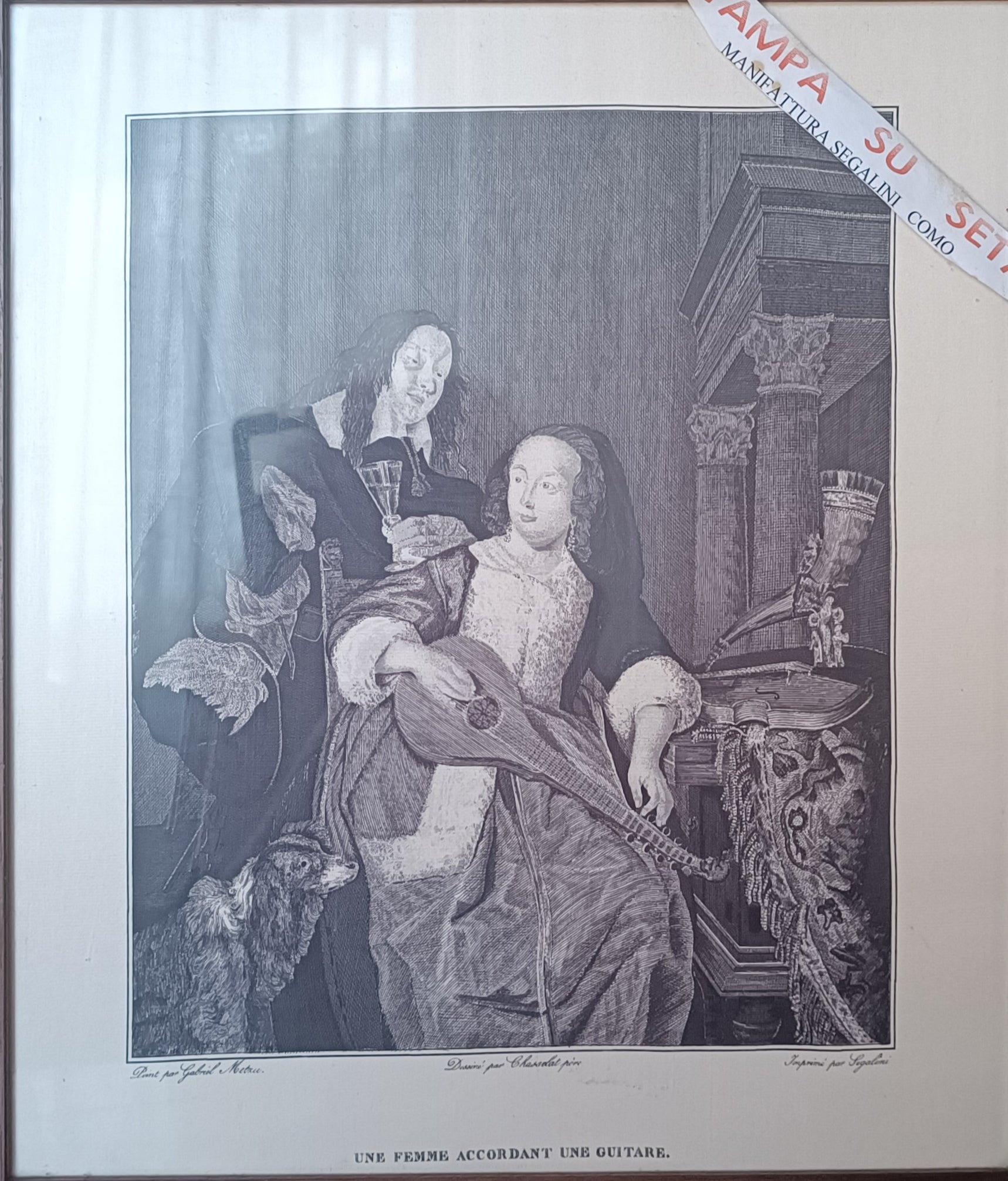 Stampa su seta Manifattura Segalini, incorniciata anni sessanta. Misure cm 40 x cm 35. Cornice in legno con vetro. 800g.