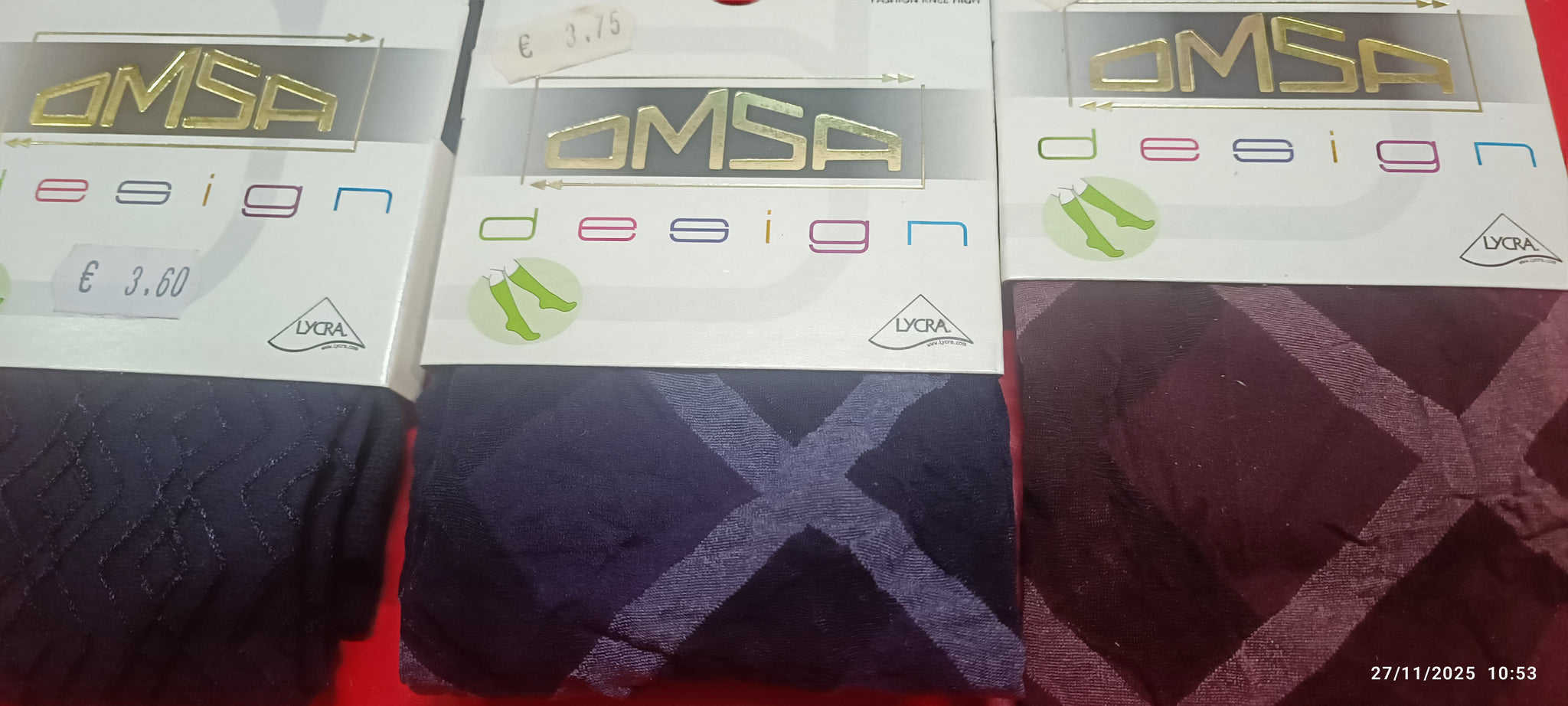 Cinque paia di gambaletti moda OMSA design, taglia unica, fantasie in foto. 150g. €13,90.