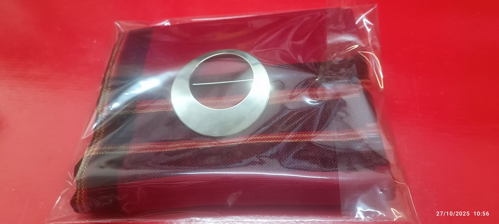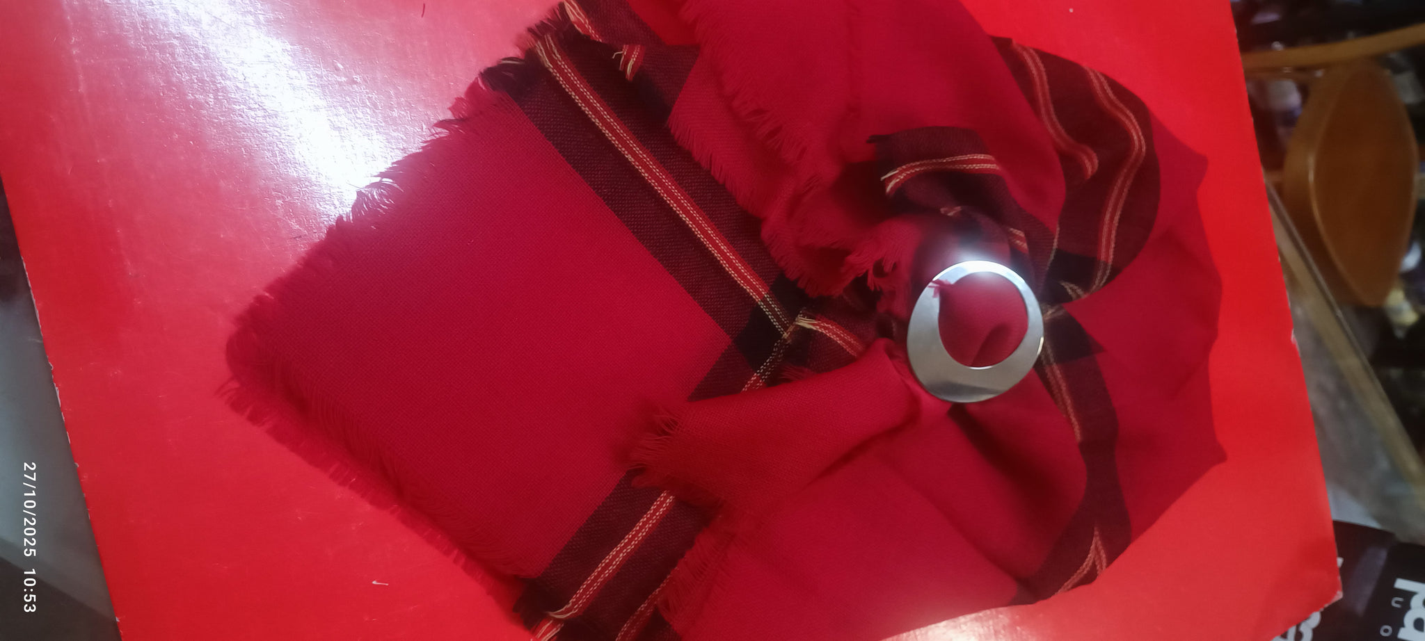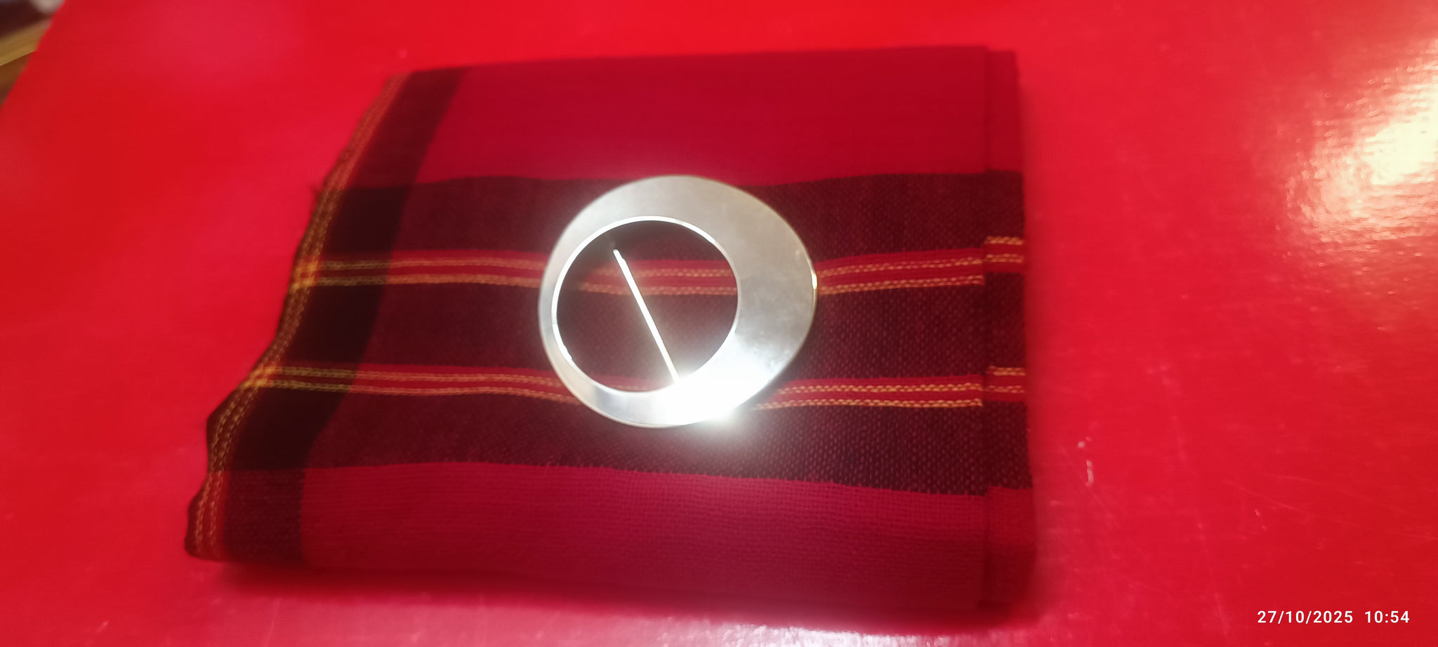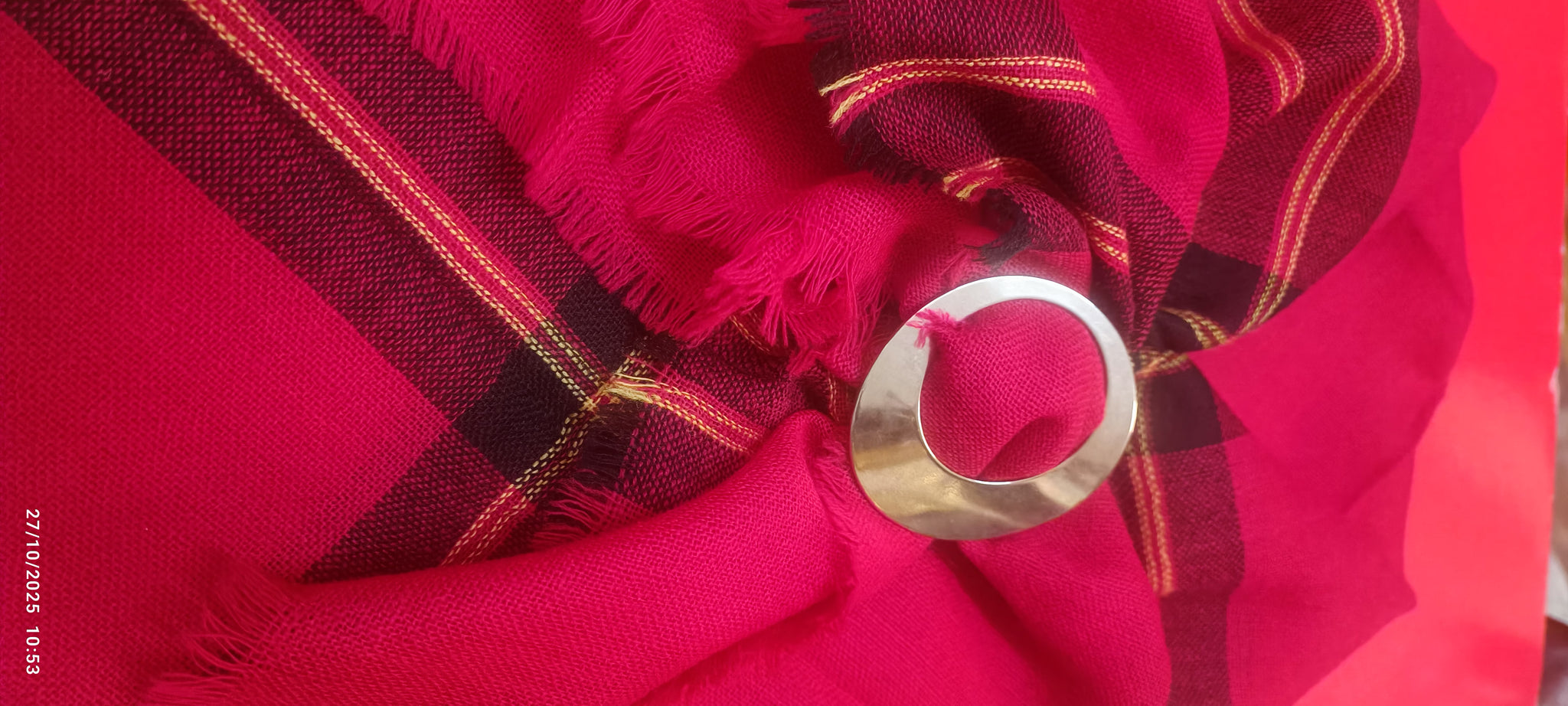 Foulard di lana a trama leggera ma calda, fantasia scozzese con elegante ferma foulard vintage in metallo . 200g.