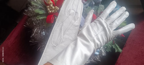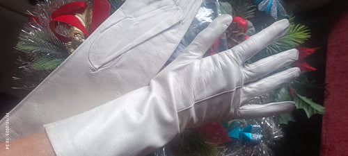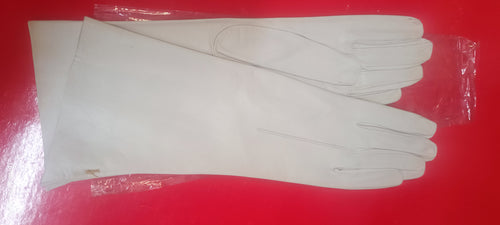Un paio di guanti lunghi vintage in vera pelle lavabile, colore ghiaccio, taglia 8,5. 100g.