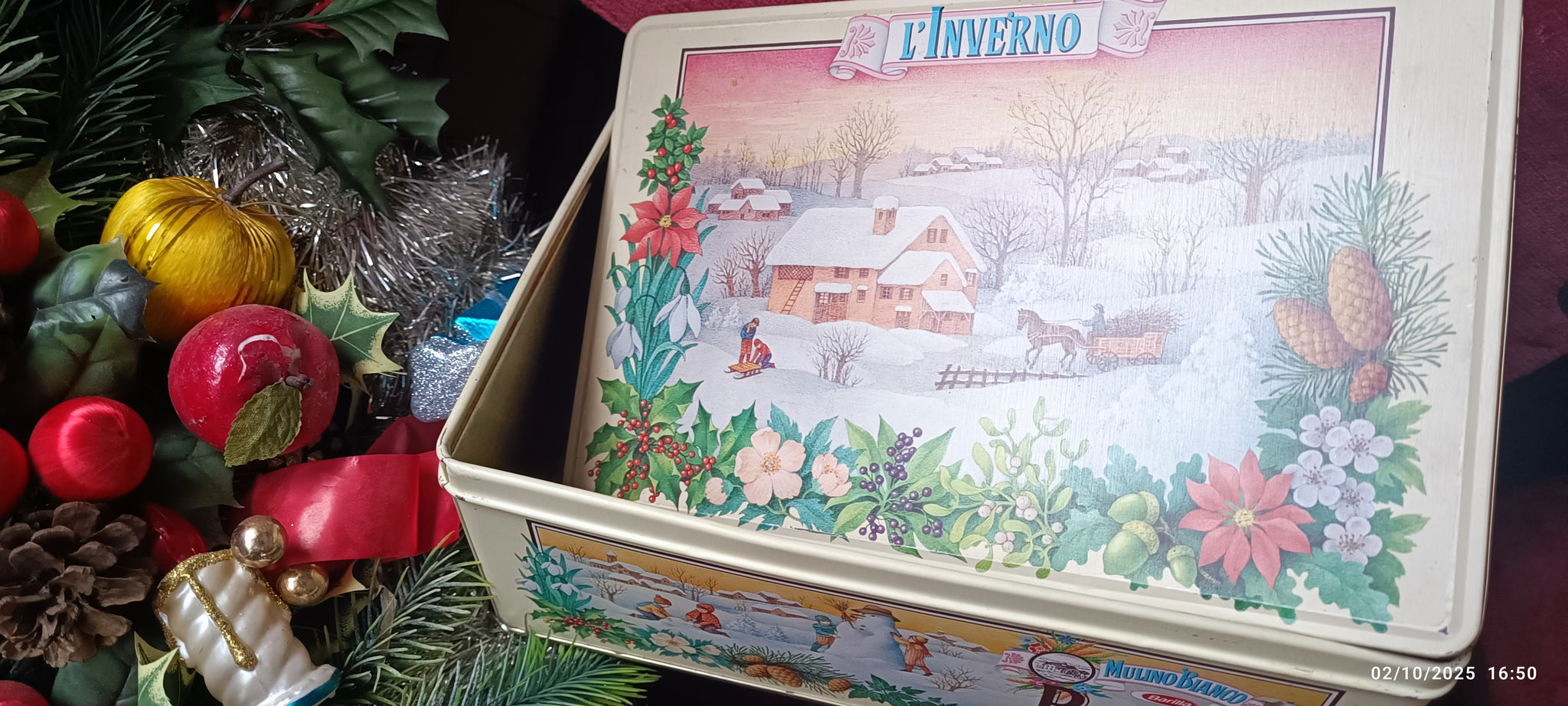 Scatola di latta anni ottanta Pan di Stelle del Mulino Bianco. Misure 10 x18 x28 cm. 300g.