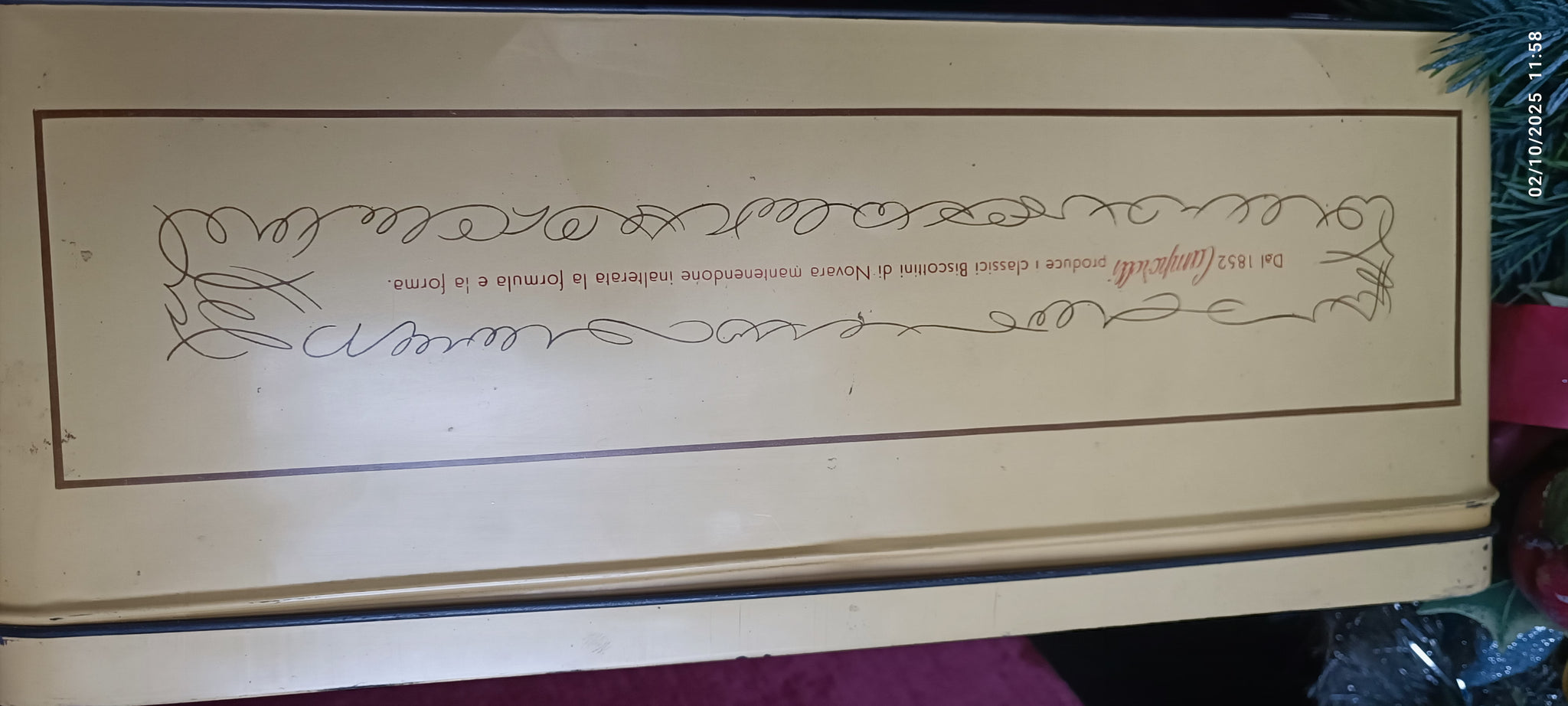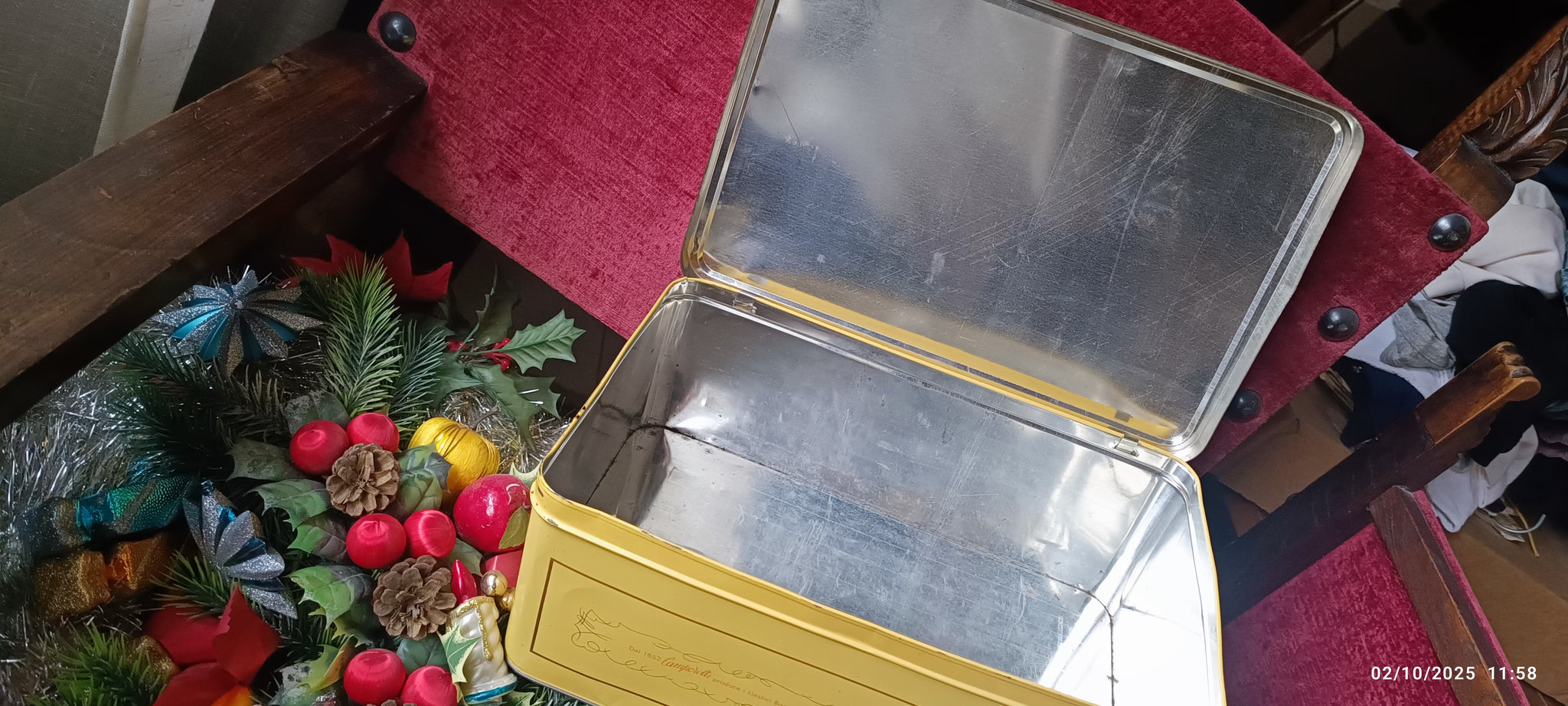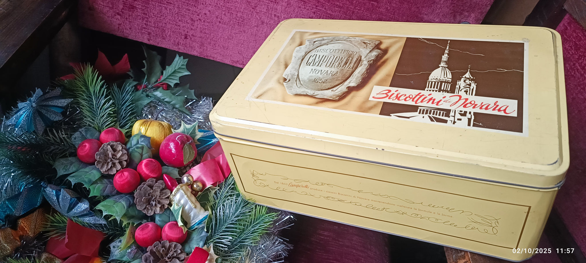 Scatola di latta vintage Biscottini di Novara Camporelli. Biscottificio da 1852. Misure 15 x 25 x 35 cm. 600g. €30,00.